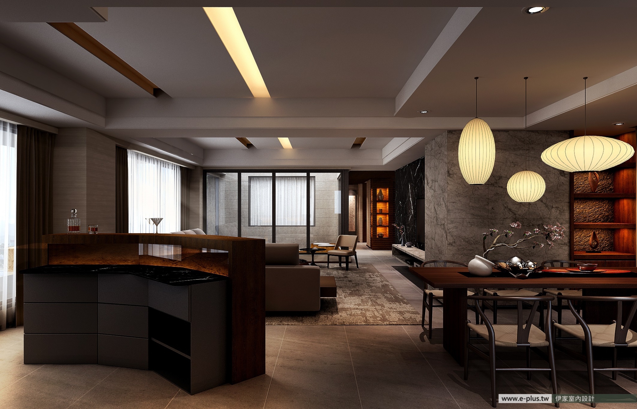 以自在寫意的人文筆觸,強調出空間量體的簡約基調,形式開放下的零壓感無拘場域,圍塑出豐富意涵的內斂生活。