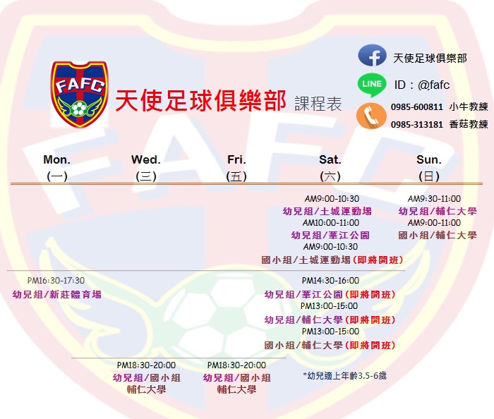 除了現有課程時間,即將在另外開班,請各位家長拭目以待。 想讓孩子消耗旺盛體力、體驗踢足球的樂趣,歡迎來試上課程。 (周六新開班時間異動更新)