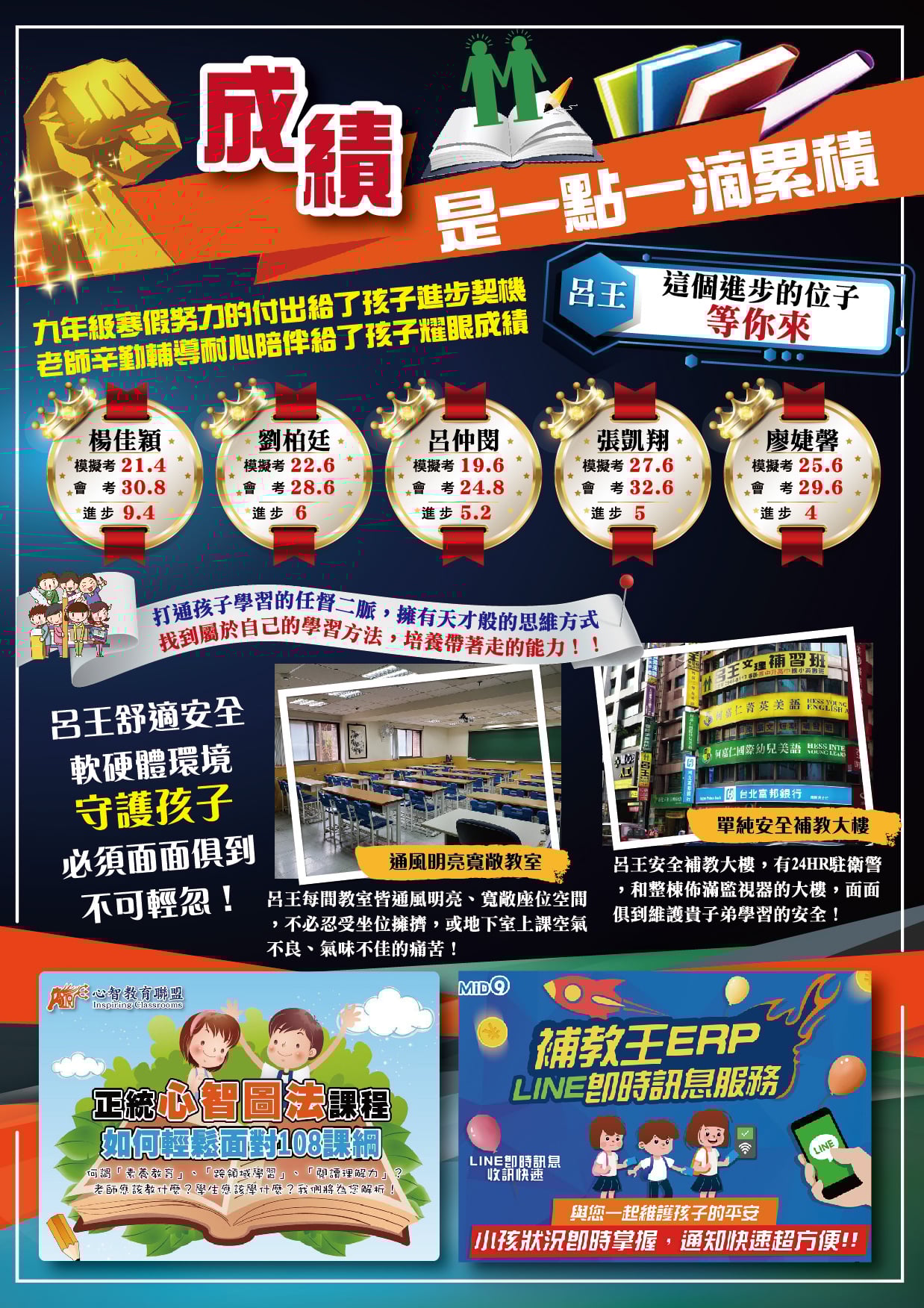 呂王位於補教商業大樓內,出入份子單純不複雜,教室的空間和座位非常寬敞,每間皆有窗戶, 防疫期間守護孩子健康與安全。每層樓都有 2 支大型樓梯和一座逃生樓梯,並有 24 小時駐衛警 守護貴子弟上課與放學的安全,加上大廈以及巷子內滿佈的監視系統,環境非常的優良安全。
