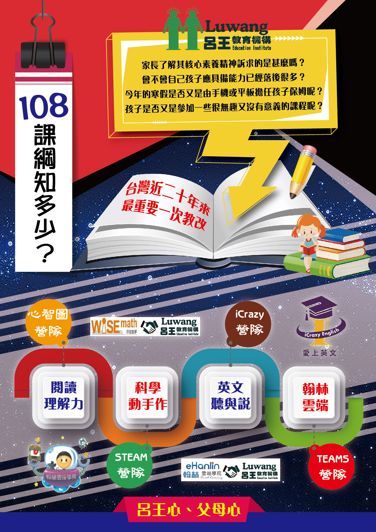 數學是訓練邏輯思考能力的學科,推演能力常常是解決問題的首重能力,目前台灣孩子的數學能 力不管在國際奧數大賽排名,還是在12K教育中課程的學習,皆衰退許多,或許跟成長的過程閱 讀太少,造成理解力大幅下降有很大的關係,因此呂王補習班數學規劃有「團班」和「個別指導 班」,適合不同程度需求、課程時間的孩子參加。團班也有分成全部學生一起上課的「大團班」以 及3~5人的「小團班」,以及自學系統的偉智數學個別指導班。