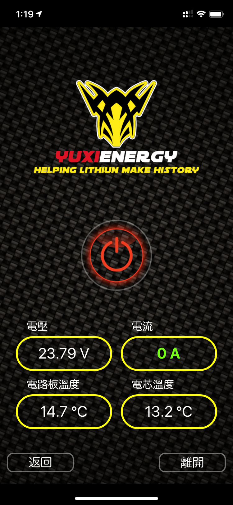 讓手機與設備連接,中間的電源按鈕若為紅色,則可按壓解除,若為綠色則可正常放電