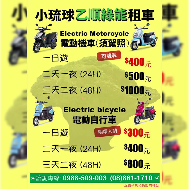 小琉球近年目標致力於打造低碳島,積極推廣在地居民及遊客使用電動車,我們代理的中華電動機車也投入大量租賃行列,不管是電池續航力跟馬力都不會輸給燃油機車,既能省荷包又能做環保。