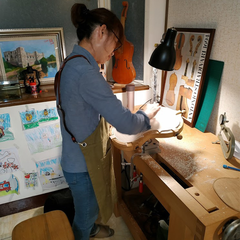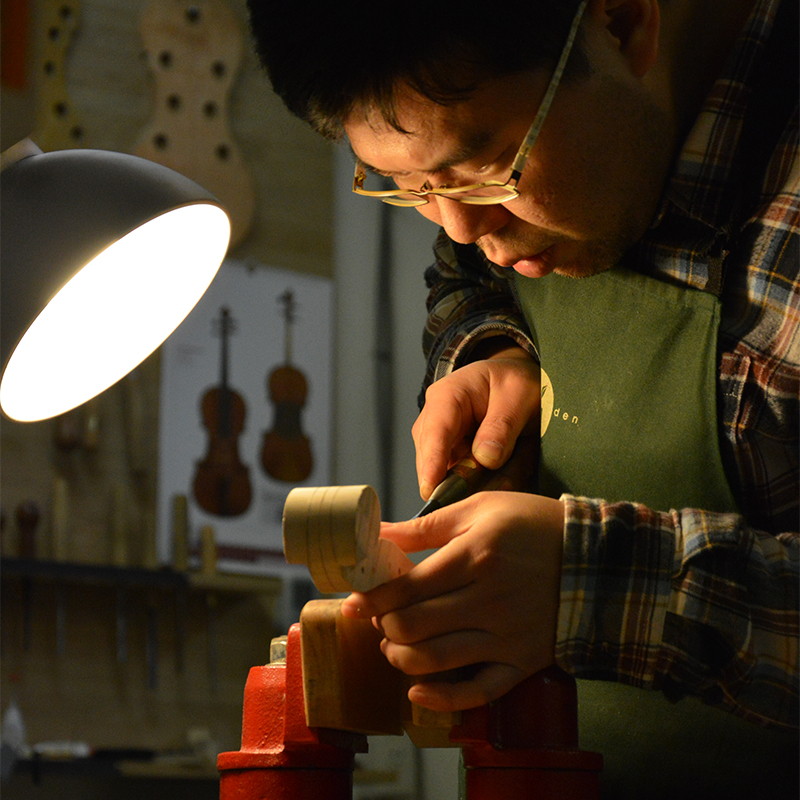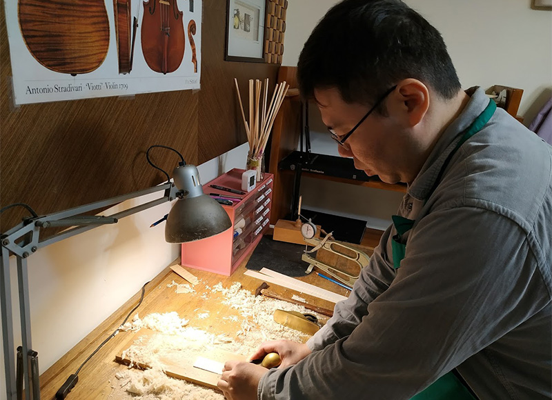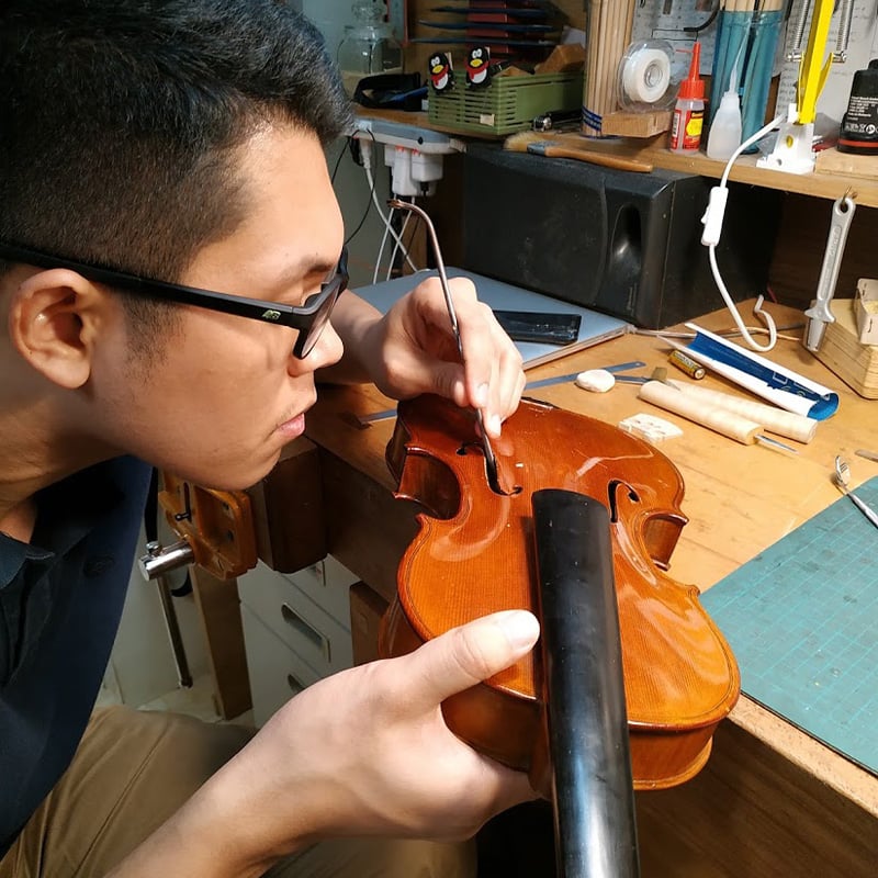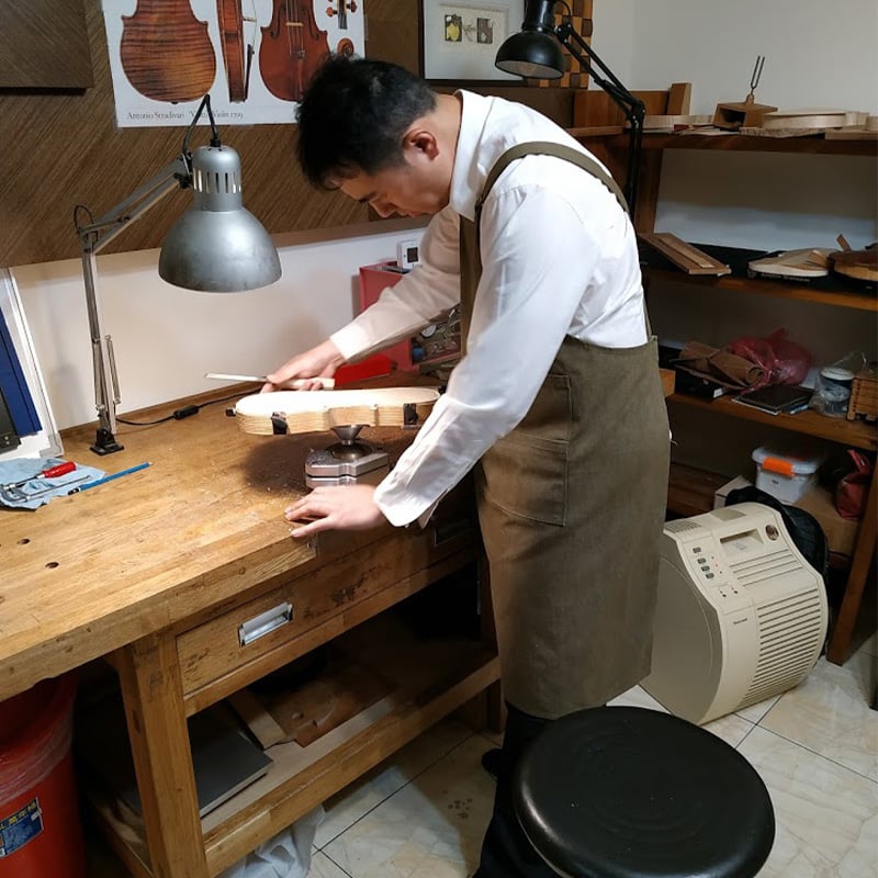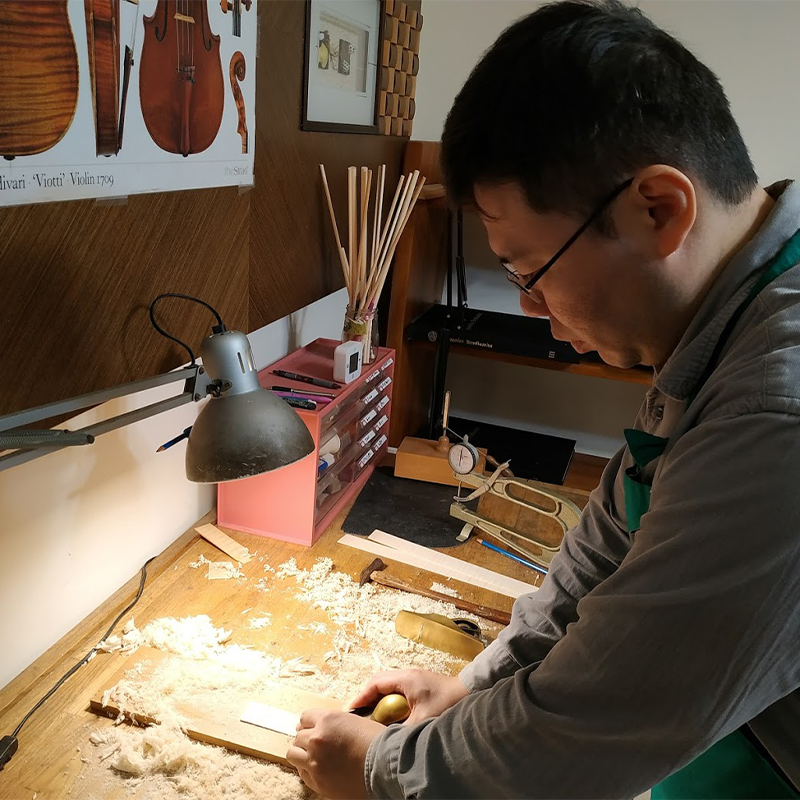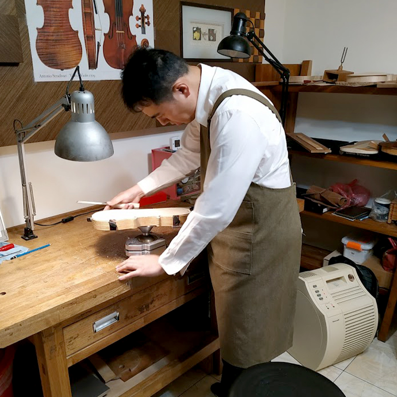 從製琴學校畢業後,一直以義大利古琴為範本,追求極致的外觀和聲音為目標,致力於製作能令專業演奏者滿意的提琴。多年維修調整的經驗加上身為演奏者的背景,在琴型選擇和設計上採用最理想的比例,兼顧良好的操控性和音色,有極佳的演奏體驗。