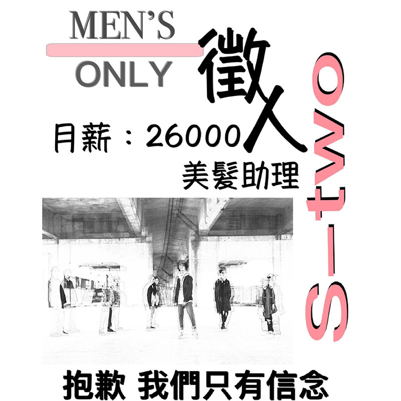 關於我們 S-two 髮醫 專屬男仕時尚造型爲主的髮廊。 在桃園經營15年以上 我們以熱情活力為主 剪、燙、染、修容 為輔 我們用技術讓客人更有自信的走出自我 我們用熱情 渲染著每個人變成朋友 我們沒有豪華裝潢 我們沒有特別服務 我們只有對夢想的執著 這是我們的本質 準備好成為我們的一份子了嗎? 我們在S-two 髮醫 等你們!