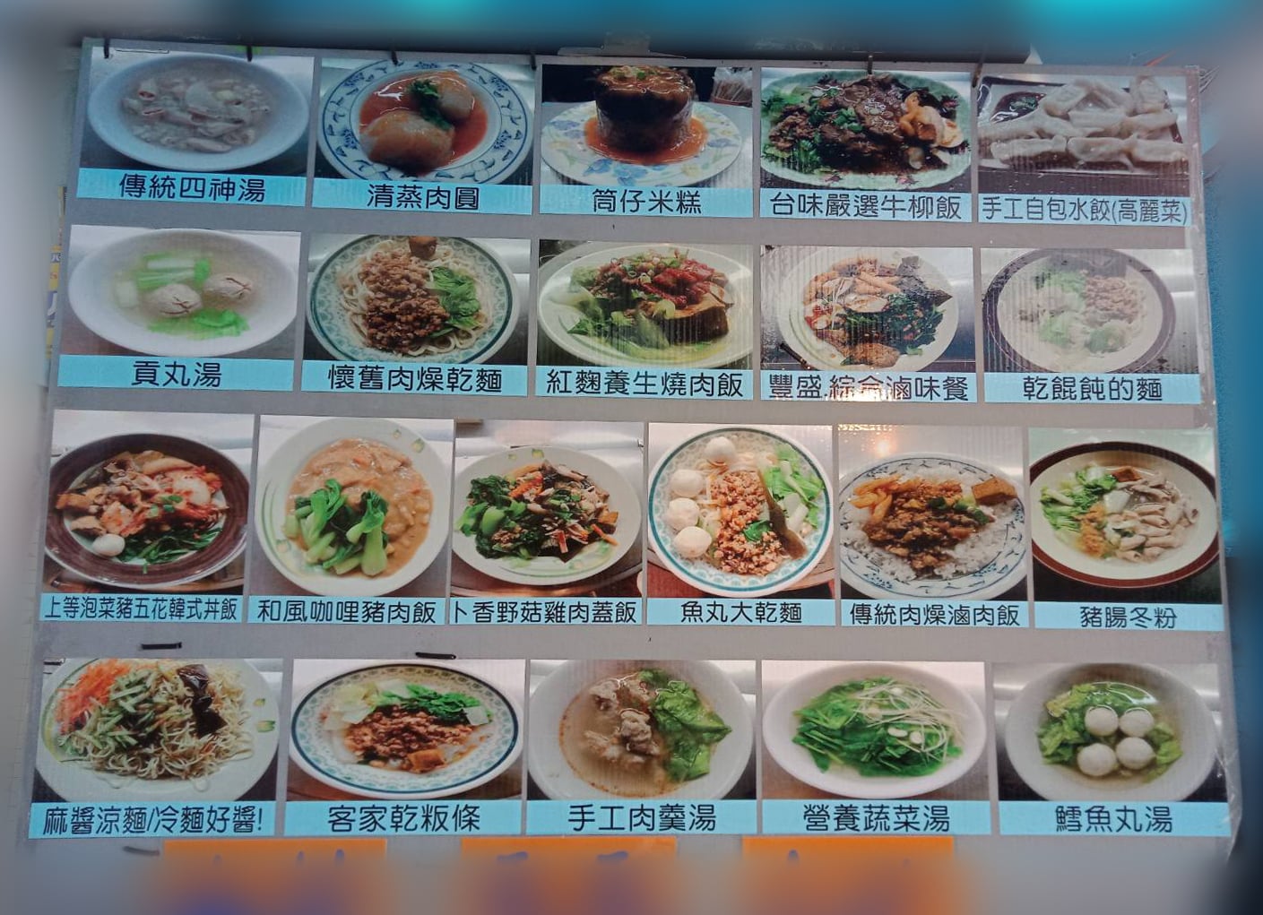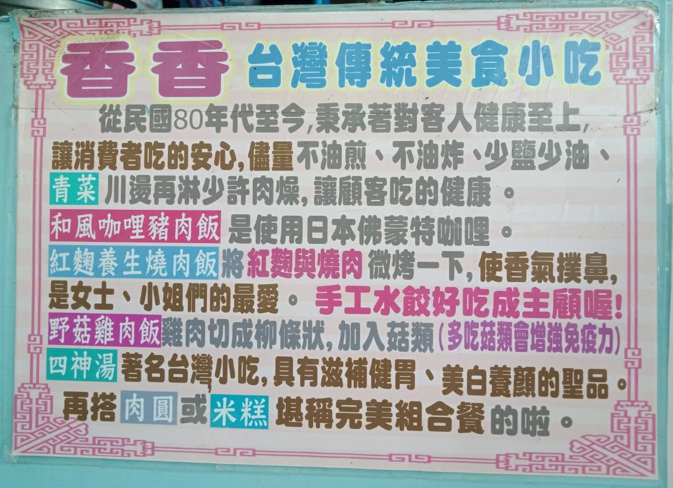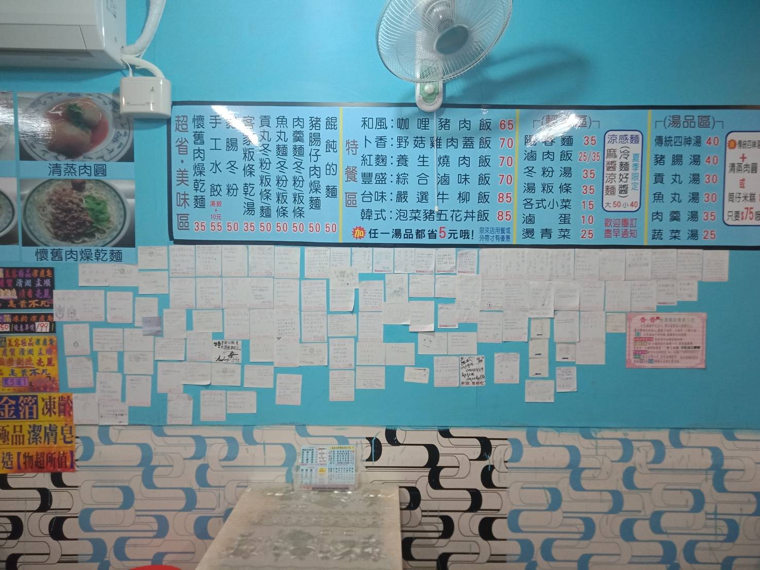 菜單 超省.美食區 懷舊肉燥乾麵$35元 手工水餃$55元湯餃+$10元 豬腸冬粉$50元 客家粄條$35元乾/湯 貢丸冬粉/粄條/麵$50元 魚丸麵/冬粉/粄條$50元 肉羹麵/冬粉/粄條$50元 餛飩的麵$50元 特餐區 (加任一湯品都省5元哦!) 和風:咖哩豬肉飯$65元 卜香:野菇雞肉蓋飯$70元 紅麴:養生燒肉飯$70元 豐盛:綜合滷味飯$70元 台式:嚴選牛柳飯$85元 韓式:泡菜豬五花丼飯$85元 輕食區 陽春麵$35元 滷肉飯小 $25/大 $35元 冬粉湯$35元 湯粄條$35元 各式小菜$15元 滷蛋$10元 燙青菜$25元 麻醬冷麵大 $50元/小 $40元夏季限定 湯品類 傳統四神湯$40元 豬腸湯$40元 貢丸湯$30元 魚丸湯$30元 肉羹湯$35元 蔬菜湯$25元 最"划算"組合 清蒸肉圓or筒仔米糕+傳統食神湯只要$75元