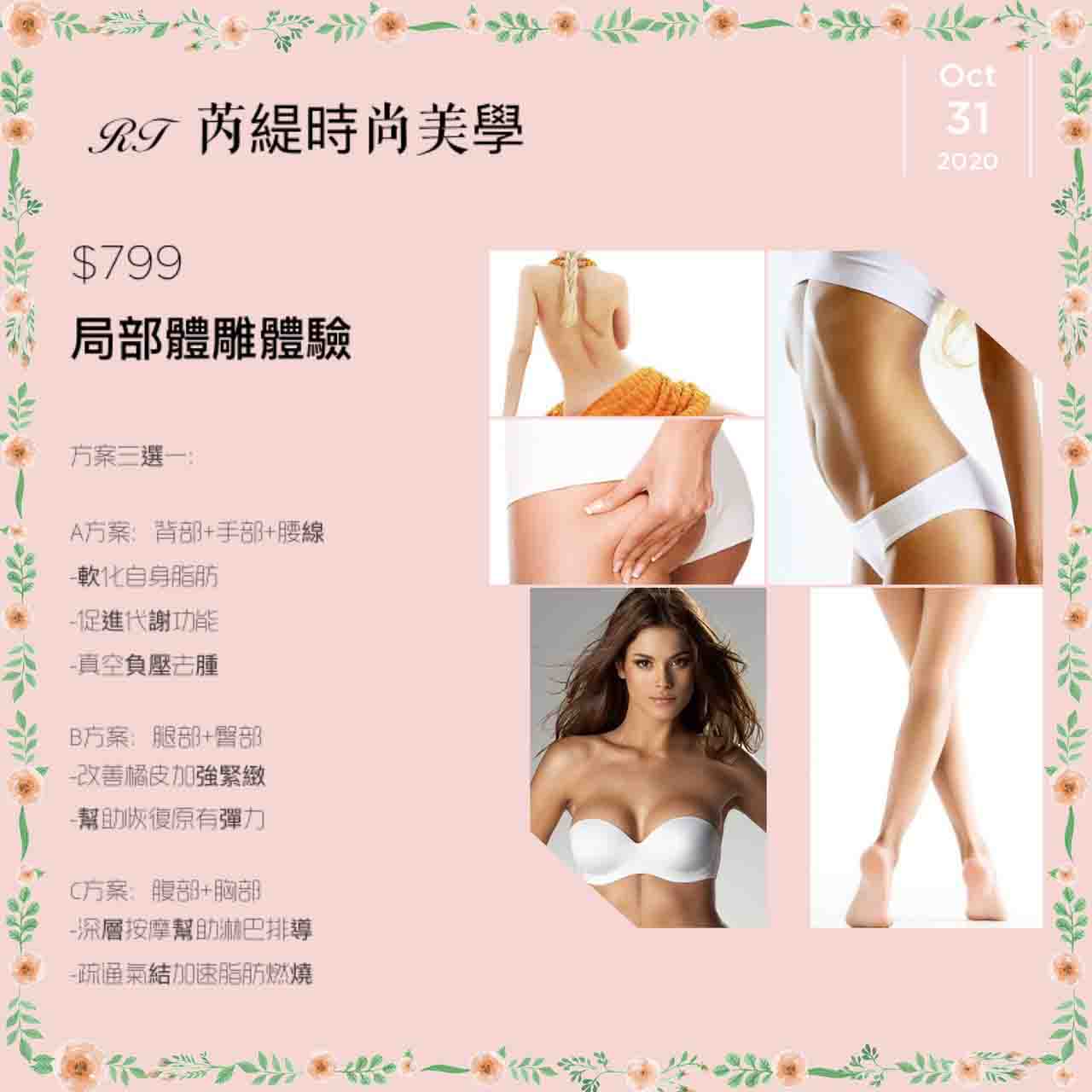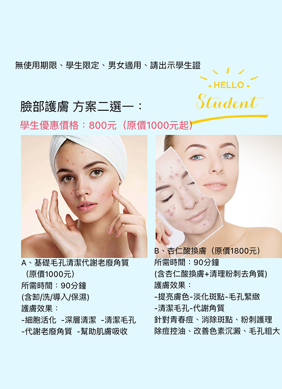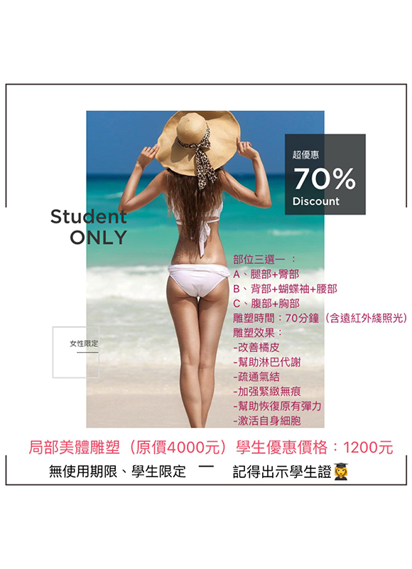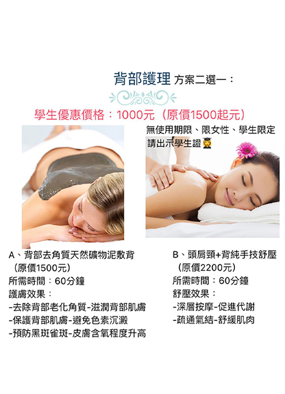 最新消息 蜜臀三重奏 + 主要課程目的: 1.緊實臀部肌膚 2.保濕潤澤,消除橘皮 3.去除老化角質 4.減少預防暗沉 5.肌膚亮白嬌嫩 6.駐癢代謝,活化刺激膠原 適合情況: 1.久坐 2.肌膚粗糙 3.橘皮產生 4.鬆垮下垂 5.臀部運動較少者 體驗時間:70分鐘 新客體驗價格:$999 臉部保養 亮白V顏三重奏 + 透過亮白V顏三重奏 綜合了亮白、清潔、提拉課程 讓你慢慢找回亮麗自信的素顔 拉住自己年輕的肌膚,留住顔值不讓歲月帶走最美的你 全程120分鐘 體驗價$999 寵愛女性二步驟 + 想要告別脂肪囤積造成副乳, 團塊,掰掰袖,虎背熊腰 同時解決容易氣血阻塞而胸悶, 肩頸手臂緊綳的問題? 聰明的女性一定知道擁有一個 年輕的子宮就是年輕不敗的關鍵 經期容易不舒服手脚冰冷? 下巴容易長痘小腹偏大? 有便秘消化不良的問題? 全程110分鐘 體驗價$999 急塑甩脂 爆汗舒壓 + 全新推出從頭到腳 全背極緻享受 不論雕塑或是紓壓一次到位 維持曲綫,身材體驗活動 !!特別升級太空艙體驗!! 全程100分鐘 體驗價$999 眼周開穴鼻周養護 + 眼睛是我們的靈魂之窗!眼睛周圍有許多經絡匯集,按摩眼睛四周,對於改善眼壓預防青光眼、近視或輕微飛蚊症有幫助。 過敏性鼻炎,嚴重影響日常作息。只要按摩4穴位,就能緩解鼻過敏不適症狀,跟「水餃衛生紙」說Bye Bye! 全程60分鐘 體驗價$899 背部放鬆三重奏 + 一重奏全背純手技深層按摩 二重奏全背去角質敷礦物泥 三重奏精華液保養滋潤肌膚 背部是最容易疏於保養的部位 想要擁有亮白無暇的背部嗎? 全程130分鐘 體驗價$999 局部美體雕塑~好評加開 A方案 + $899/體驗價 A方案 雕塑部位:背部+手部+腰線 雕塑時間:90分鐘(熱滑+手技+照光) 雕塑效果: -幫助淋巴排毒 -軟化自身脂肪 -改善橘皮 -真空負壓去腫 -深層按摩 -促進代謝功能 -疏通氣結 -幫助淋巴排導 -舒緩肌肉 體驗活動期限2021/12/15 局部美體雕塑~好評加開 B方案 + $899/體驗價 B方案 雕塑部位:腿部+臀部 (微笑線) 雕塑時間:90分鐘(3D緊緻滑吸座+體刷+照光) 雕塑效果: -改善橘皮 -幫助淋巴代謝 -疏通氣結 -加强緊緻無痕 -幫助恢復原有彈力 -激活自身細胞 活動期限2021/12/15 背部護理方案二選一 + 背部護理方案二選一 學生優惠價格:1000元(原價1500元起) 無使用期限、限女性、學生限定請出示學生證 A、背部去角質天然礦物泥敷背(原價1500元) 所需時間:60分鐘 護膚效果: -去除背部老化角質-滋潤背部肌膚 -保護背部肌膚-避免色素沉澱 -預防黑斑雀斑-皮膚含氧程度升高 B、頭肩頸+背純手技舒壓(原價2200元) 所需時間:60分鐘 舒壓效果: -深層按摩-促進代謝 -疏通氣結-舒緩肌肉 臉部護理方案二選一 + 臉部護理方案二選一 學生優惠價格:800元(原價1000元起) 無使用期限、學生限定、男女適用、請出示學生證 A、基礎毛孔清潔代謝老廢角質(原價1000元) 所需時間:90分鐘 (含卸/洗/導入/保濕) 護膚效果: -細胞活化-深層清潔-清潔毛孔 -代謝老廢角質-幫助皮膚吸收 B、杏仁酸換膚(原價1800元) 所需時間:90分鐘 (含杏仁酸換膚+清理粉刺去角質) 護膚效果: -提亮膚色-淡化斑點-毛孔緊緻 -清潔毛孔-代謝角質 針對青春痘、消除斑點、粉刺護理 除痘控油、改善色素沉澱、毛孔粗大 部位三選一 + 部位三選一: A、腿部+臀部 B、背部+蝴蝶袖+腰部 C、腹部+胸部 雕塑時間:70分鐘(含遠紅外線照光) 雕塑效果: -改善橘皮 -幫助淋巴代謝 -疏通氣結 -加強緊緻無痕 -幫助恢復原有彈力 -激活自身細胞 局部美體雕塑(原價4000元) 學生優惠價格:1200元 無使用期限、學生限定-記得出示學生證