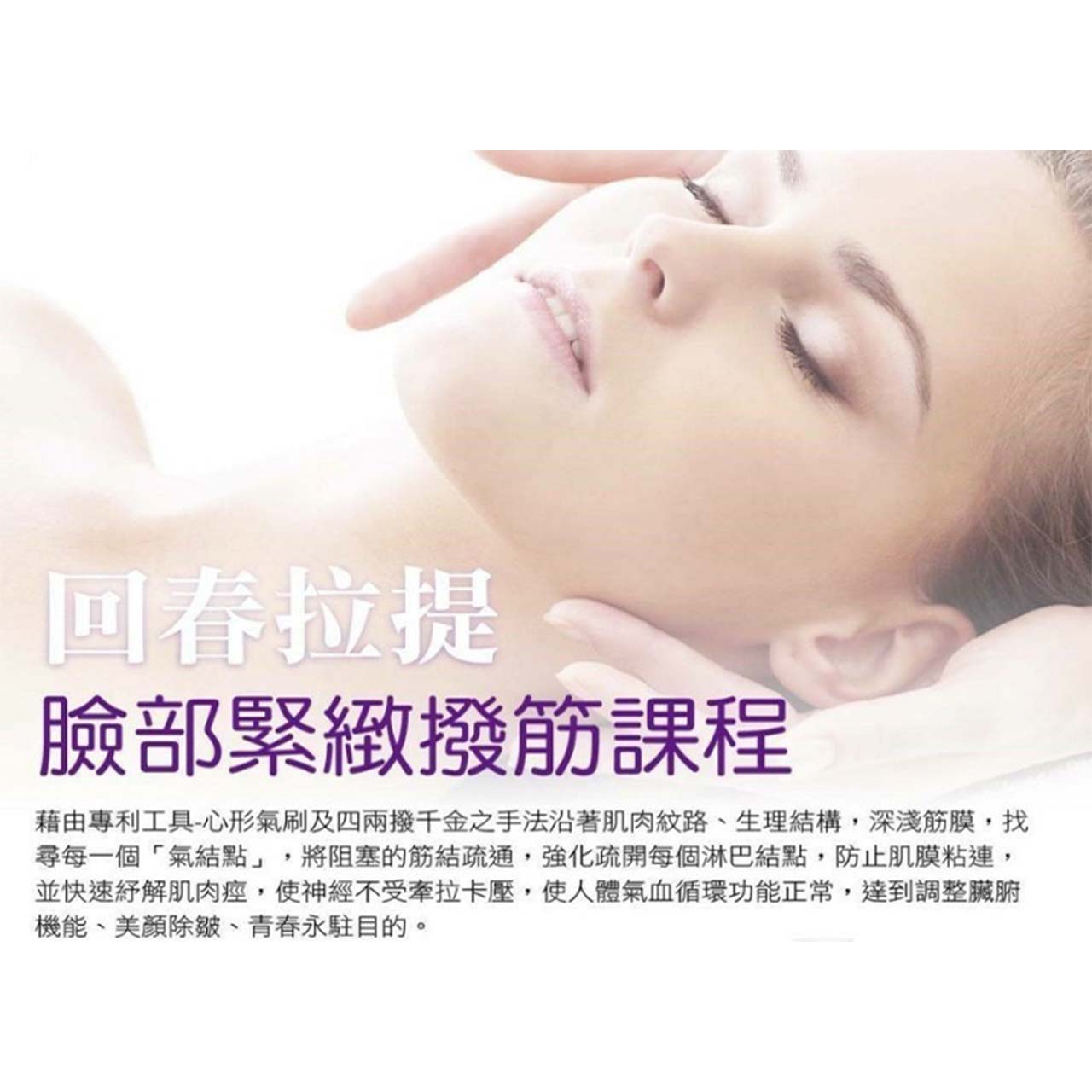 服務項目 臉部護膚(粉紅氣波課程) 60分鐘/首次體驗價格$1,800 課程特色: 按摩緊俏 豐潤肌膚 肌膚含氧量高 臉部明亮光澤 增强循環代謝 幫助肌膚產生波動韻律 臉部護膚(亮白V顔三重奏) 120分鐘/首次體驗價格$2500 課程特色: 深層按摩 去除老化角質 緊實循環 順氣提拉 透亮鎖水 嫩白緊肌 深層清潔 V顏淋巴排毒 促進新陳代謝 刺激肌膚細胞活化 改善老化肌膚 增加肌膚彈力 預防肌膚下垂 臉部護膚(美人雙機綜合保養課程) 90分鐘/首次體驗價格$2888 三種方案選擇(A保濕拉提系列 B緊實亮白系列 C净膚抗敏系列) A保濕拉提系列 毛孔緊緻收縮 無針保濕駐顔 手技按摩提拉 專業六波拉電波拉皮 頭肩頸經絡紓壓 B緊實亮白系列 高保濕修護精華 抗齡緊實V臉 四兩撥千斤手技按摩 RF全臉眼周活化彈力循環 特有手技代謝撫紋按摩 頭肩頸經絡紓壓 C净膚抗敏系列 柔敏全能霜臉部循環順氣按摩 專業手工深層粉刺清除 四胜肽草本複合抗敏精華 頭肩頸經絡紓壓 特別保養(眼鼻周開穴保養) 60分鐘/首次體驗價格$1200 課程特色: 手技按摩 深層代謝 緊實循環 預防眼壓 穴點疏通 降低過敏症狀 減少並預防細紋 淡化黑眼圈 提亮眼周 增加眼周肌膚彈力 降低並減緩過敏產生的不適 蜜臀三重奏 60分鐘/首次體驗價$2000 課程特色: 緊實臀部肌膚 保濕潤澤,消除橘皮 去除老化角質 減少預防暗沉 肌膚亮白嬌嫩 駐氧代謝,活化刺激膠原 美體保養(背部放鬆三重奏) 120分鐘/$3000 Special Set 課程套組内容: 一重奏全背純手技深層按摩 二重奏全背去角質敷礦物泥 三重奏精華液保養滋潤肌膚 去除老廢角質 滋潤肌膚,提亮膚色 疏通氣結舒緩肌肉 避免色素沉澱 預防暗沉,黑斑 提升肌膚含氧量 促進代謝淋巴排毒 美體保養(寵愛雙重奏) 120分鐘/首次體驗價格$3600 課程特色: 告別副乳,預防阻塞 挺立拉提,集中Q彈 循環代謝,改善宮寒 改善氣虛,延緩老化 軟化腹部脂肪,幫助腸道蠕動 舒緩經期不順,預防手腳冰冷 臉部緊緻撥筋課程 【60分鐘】 首次體驗價格 NTD 1800 針對部位:臉部 針對暗沉、鬆弛、皺紋肌膚 加强臉部頭頸血液循環,使細胞活化提升肌膚代謝率。 緊實拉提V臉再現。 抗齡回春,豐潤彈力,明亮紅潤。 *搭配疏筋引流精油使用* 柔敏養護再生護理 【60分鐘】 首次體驗價格 NTD 1800 針對部位:臉部 舒緩,抗發炎,止癢,降低發紅,抗脫屑,平滑肌膚,保濕 *課程贈送積雪草精華及積雪草全能霜* 防疫大作戰 前後肺腺養護排毒【110分鐘】 首次體驗價格 NTD 1880 針對部位:背部、前胸 加强肺部新陳代謝 排除廢氣油煙 增强肺葉功能、代謝老痰 善氣虛、加强呼吸道、氣管功能 *課程贈送膠原蛋白面膜2片* 光學除毛 首次體驗價格 私密處全除 (90分鐘) $4500 比基尼線 (60分鐘) $2000 腋下 (40分鐘) $1500 手 (40分鐘) $2000 腳 (60分鐘) $2500 鬍子 (40分鐘) $2500 固定施打可達到半永久效果 幾乎零痛感 價格平易近人 免敷麻 全身去角質/背部去角質 首次體驗價格 NTD 2500/1000 針對部位:全身/背部 120分鐘/60分鐘 去除老化角質 滋潤皮膚 保護皮膚 避免色素沉澱 預防黑斑、雀斑 皮膚氧化程度升高 *使用天然死海礦物泥* 全身/背部放鬆舒壓(含全身正反面)【70~100分鐘專業手技】 首次體驗價格 全身NTD 2500/背部NTD 1800 針對部位:全身 深層按摩 促進代謝 疏通氣結 淋巴排導 舒緩肌肉 *純手技* 養身凍齡暖宮【60分鐘】 首次體驗價格 NTD 2200 針對部位:腹部 促進血液及淋巴循環 燃燒脂肪 改善宮寒及手脚冰冷 改善氣虛 調理内分泌系統 舒緩經前緊張及不適 改善乏力及心煩失眠 延緩更年期 促進腸胃蠕動有效排毒 預防便秘 美胸拉提緊實【30分鐘】 首次體驗價格 NTD 1500 針對部位:胸部 激活拉提穴位、開通胸線促進循環、滋養精油挺立疏️ 日本IPL美白光【60分鐘】 首次體驗價格 NTD 1500 針對部位:臉部 淡化黑色素 明亮膚色 毛孔緊緻 局部體雕【90分鐘】 首次體驗價格 NTD 1800起 針對部位:部位任選 加速排毒 深層按摩 揉散脂肪 改善橘皮 淋巴代謝 疏通氣結 淋巴排導 舒緩肌肉 *專業手技+體刷或儀器* 臉部護膚【90分鐘】 (基本清理去角質+清理粉刺) 首次體驗價格 NTD 1000 針對部位:臉部 細胞活化 深層清潔 清潔毛孔 代謝老廢角質 臉部護膚【90分鐘】 (杏仁酸換膚+清理粉刺老舊角質) 首次體驗價格 NTD 1200 針對部位:臉部 淡化斑點 清潔毛孔 毛孔 提亮膚色 臉部護膚【60分鐘】 (3D FACE) 首次體驗價格 NTD 2500 針對部位:臉部 真空負壓去水腫 雕塑緊緻 活化角質細胞 臉部護膚【60分鐘】 (無針美塑保濕拉提) 首次體驗價格 NTD 1800 針對部位:臉部 深層補水 拉提動態紋路 刺激膠原蛋白增生 臉部護膚【60分鐘】 (RF 熱感雙射頻 全臉+眼周) 首次體驗價格 NTD 1500 針對部位:臉部 改善眼周暗沉 活化循環 延緩老化 臉部護膚【60分鐘】 (六極電波拉皮) 首次體驗價格 NTD 1500 針對部位:臉部 刺激真皮層收縮 緊緻拉提 減淺皺紋 刺激皮下膠原再生 臉部護膚【60分鐘】 (剪雕手) 首次體驗價格 NTD 1800 針對部位:臉部 淋巴引流 緊緻拉提修飾輪廓 瘦小臉 V臉雕塑 臉部護膚【60分鐘】 (海藻微晶換膚) 首次體驗價格 NTD 3000 針對部位:臉部 改善痘痘肌膚 膠原蛋白增生 緊值毛孔 淡化痘疤 減少暗沉 瀊太極天然精油能量紓壓【120分鐘】 首次體驗價格 NTD 2000 針對部位:足部、背部、後腿、頭部、腹部 針對僵硬肌肉、易疲勞、黑色素沉澱、脂肪囤積、橘皮纏身、代謝