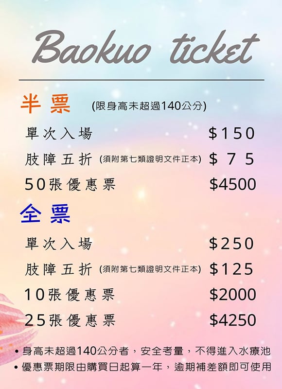 位於台中的『寶闊健康活水休閒館』,有著全台中最棒的戲水設施和水療設備,由本來在南投經營活水休閒館的洪教練一手打造,斥資三千多萬打造的『寶闊健康活水休閒館』除了擁有清淨水質的室內室外游泳池外,還有SPA水療設施、泡浴按摩池、蒸氣室、烤箱、冰水池等,另有小朋友最喜歡的滑水道及玩水遊戲機。