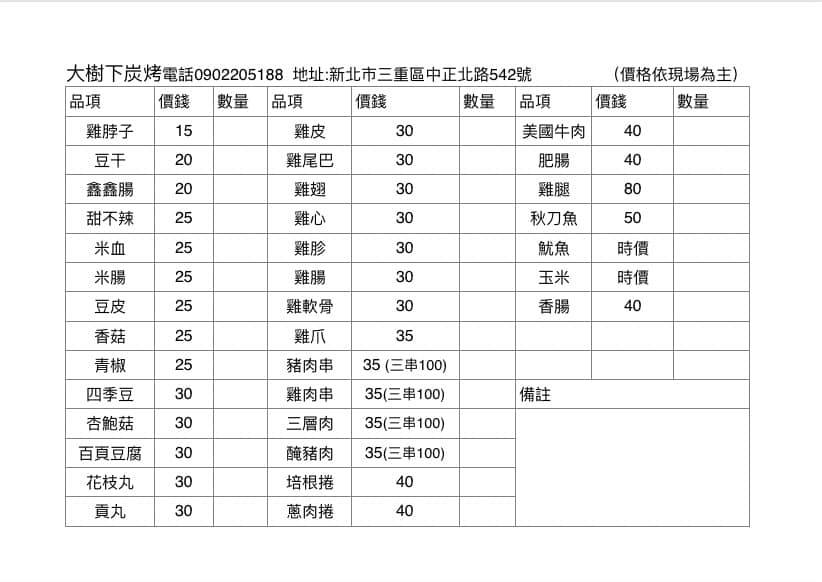 關於我們 大樹下炭烤 位於新北三重區的一間炭烤店,堅持現點現烤,無外面坊間先炸後烤的方式,堅持以木炭純炭火的方式料理,保留食物原有的風味。這醬料是從小吃到現在的好味道,為了分享更多人吃到美味的串燒於是開始了「大樹下炭烤」,食材用料不隨便,料理方式也堅持純木炭生烤完成。只為了客人安心的吃好,享受串燒的美味。 最新消息 Ubereats餐廳上線了! + 現在也可使用Ubereats線上點餐,不用出門也可享用美味的串燒燒烤。 立即下訂 價目表 風味燒烤 店面環境 聯絡我們 地址 新北市三重區中正北路542號之一 訂購專線 0902 205 188 營業時間 週二~週六17:25-23:00,週日、週一公休
