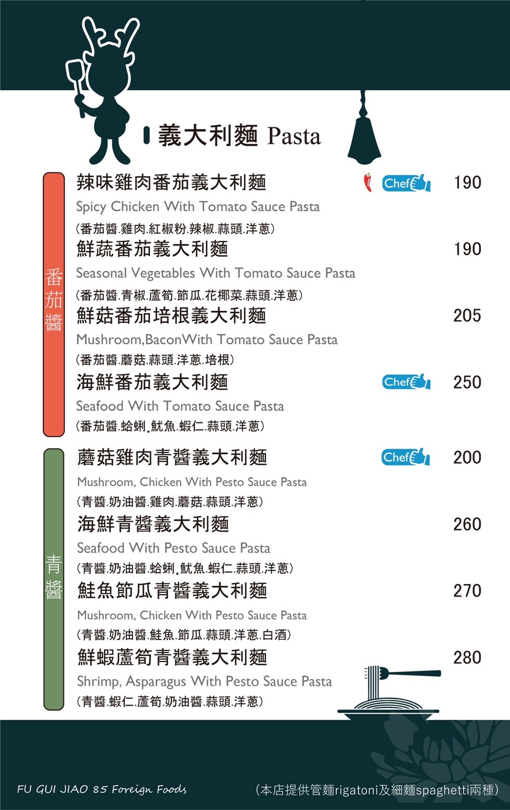 本店舖使用的食材大多來自於進口,產品是選用好的食材、簡單的調味以平價的價格來呈現的,目前有義式料理、中式料理,調整好最好的醬汁,研究色香味俱全,是我們一直在努力的目標,未來有機會一定會開發出更多各國的料理。