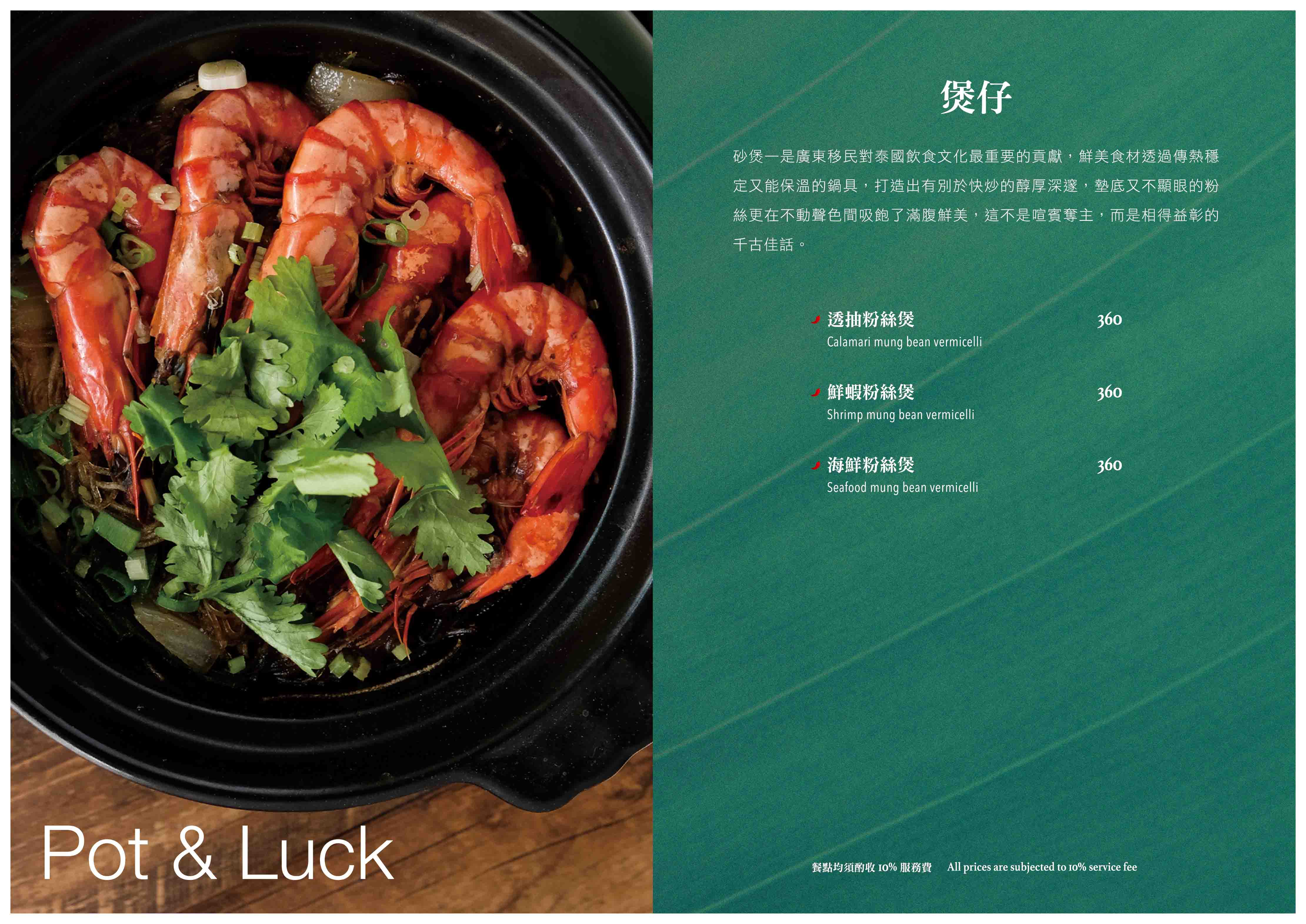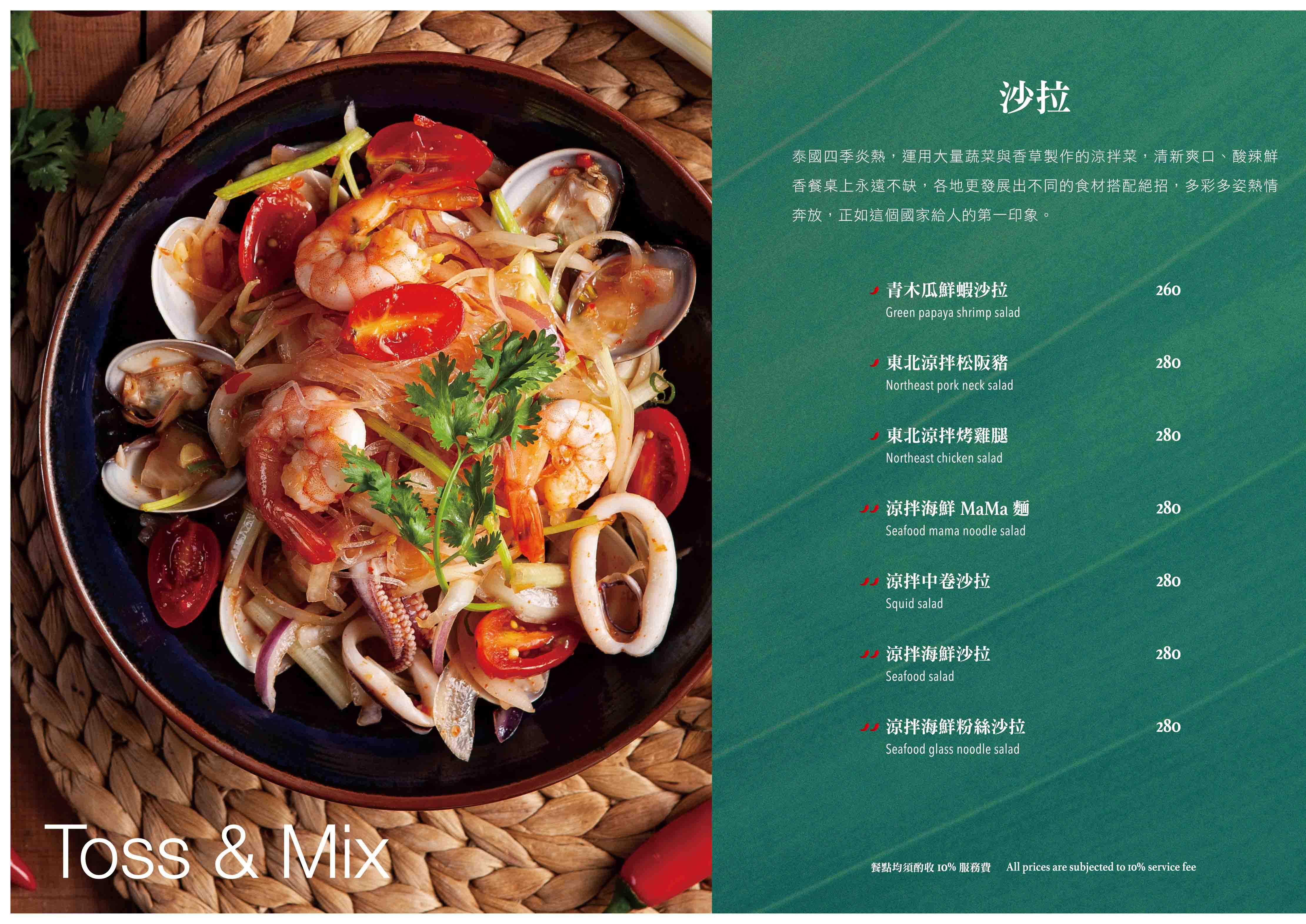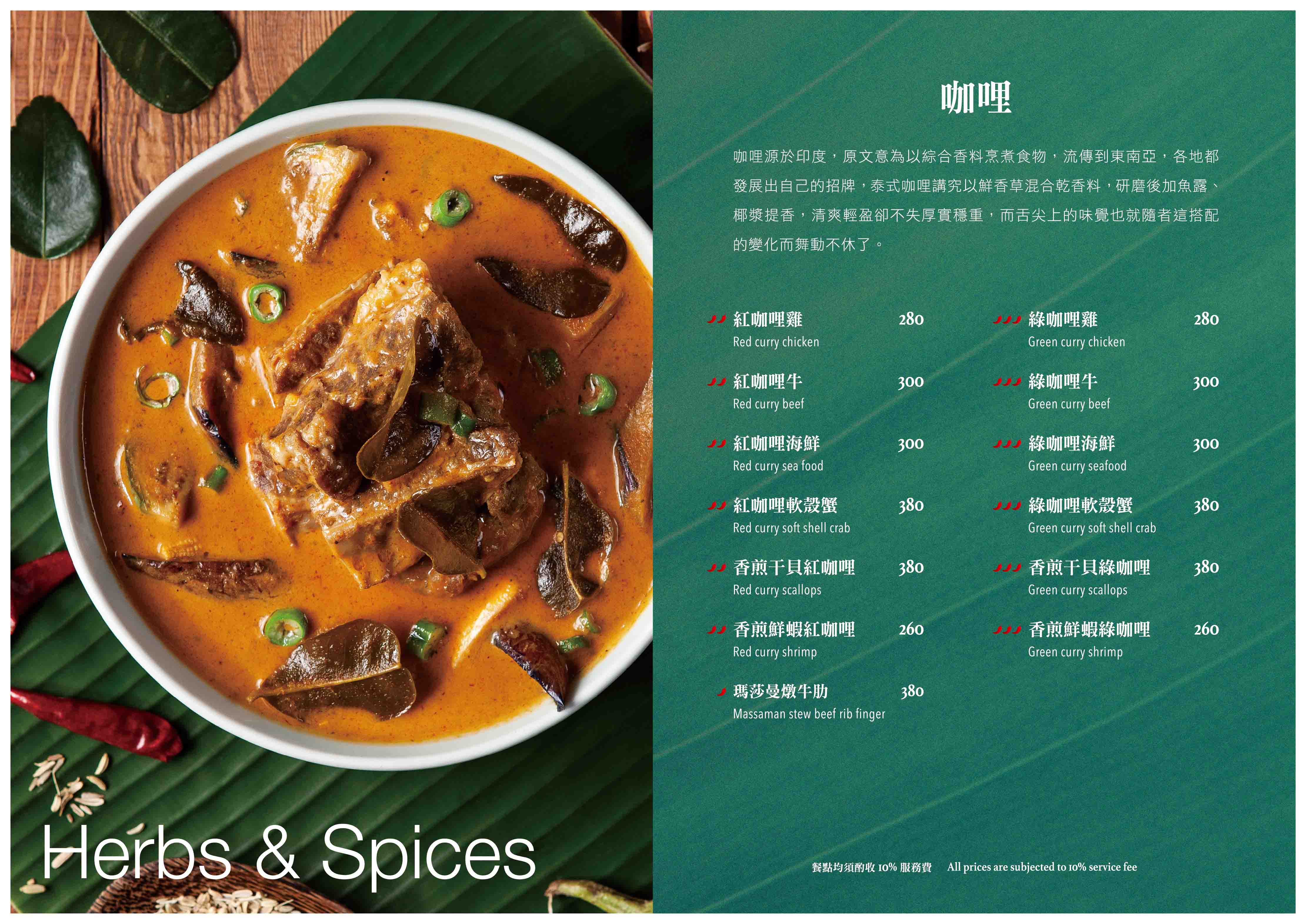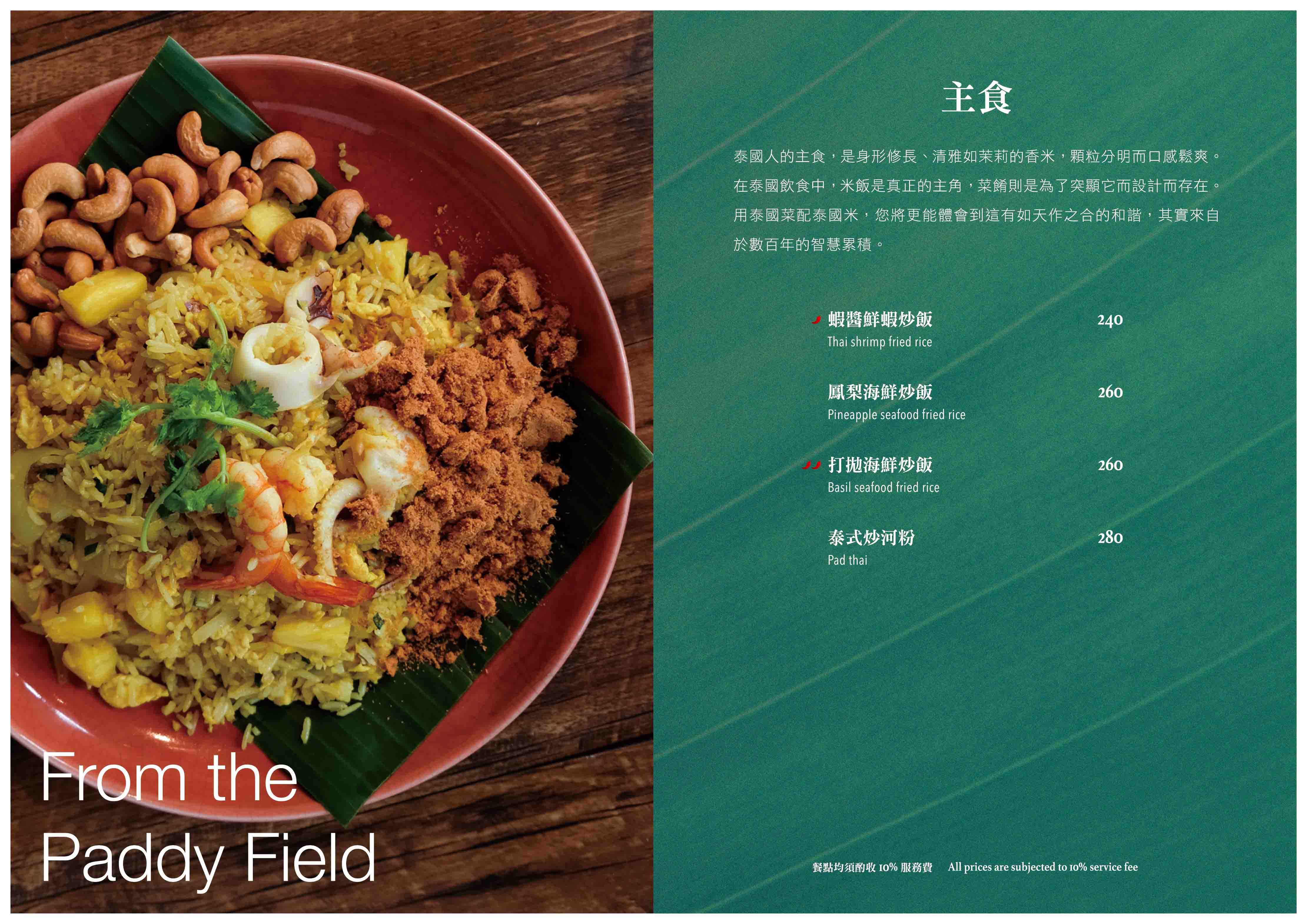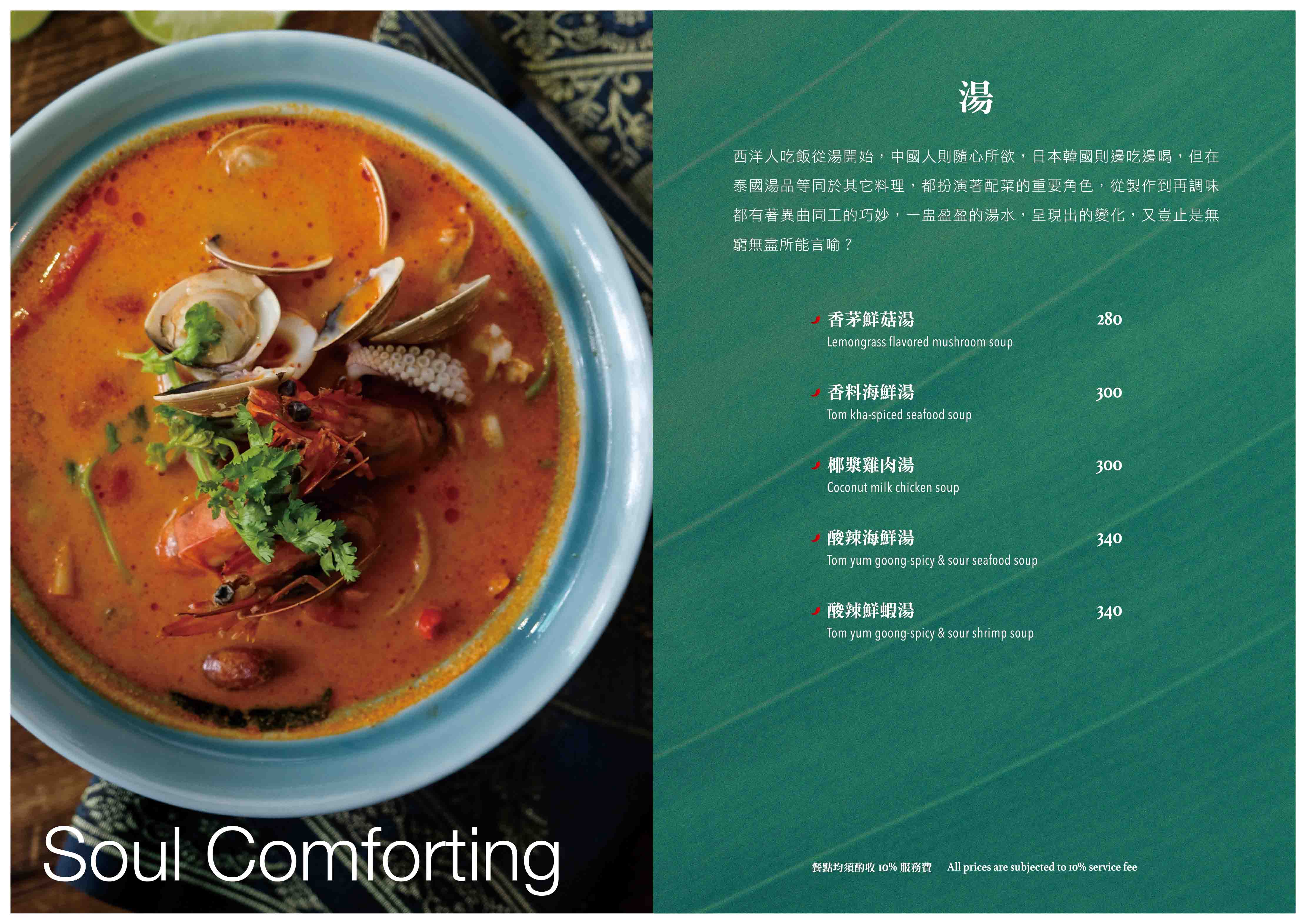 以泰國道地餐點為基礎,加上台灣人喜好的口味與菜色,梳理成一道道精緻、美味的餐點。調味料是泰國菜精髓,從泰國進口香料,不用現成醬料而是在地自製,讓每一個客人都可以感受到新鮮與更在地的口味,料理內餡、湯品醬汁,透過師傅的手藝,將台灣人喜歡的「泰國味」重新詮釋。