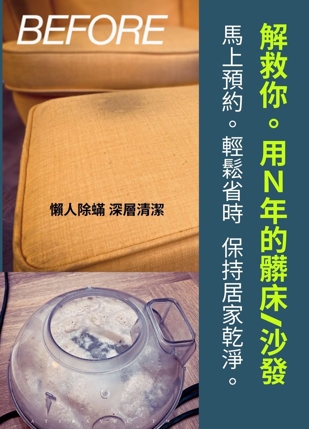 最新研究出的『超潔技法』能夠迅速解決大家長年污漬問題!現在接受各位預約體驗服務,還原您床墊或沙發更新面貌!去除污漬、血漬、臭味,救回你珍愛高級又舒適的好床或沙發!