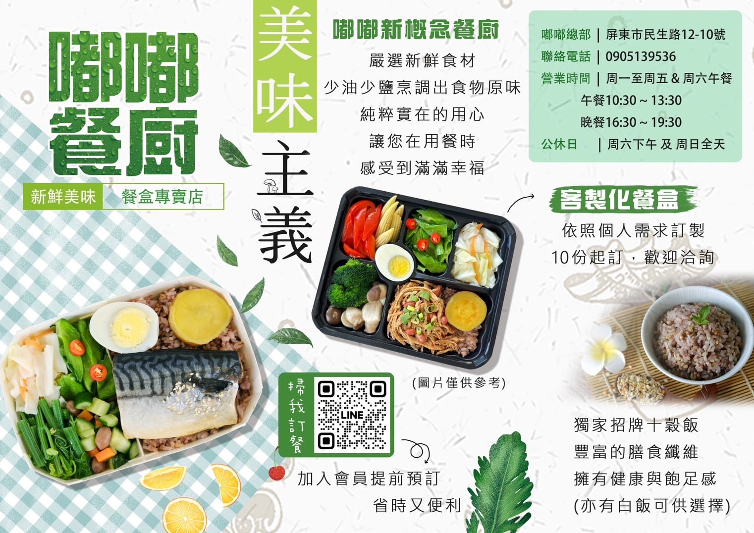 關於嘟嘟 嘟嘟新概念餐廚 嘟嘟新概念餐廚以原型食物 搭配當季盛產的時令蔬菜 少油少鹽的烹調及多變的菜色 讓每位朋友都能夠感受到原型的食材也能變化得如此美味 主打獨家特製十穀飯 有多種人體所需微量元素 富含飽足感同時多了膳食纖維 營養均衡又健康 (另有白米飯可供選擇) 用餐選擇嘟嘟 為您注入滿滿的元氣 加入會員提前預訂 還能縮短取餐時間喔