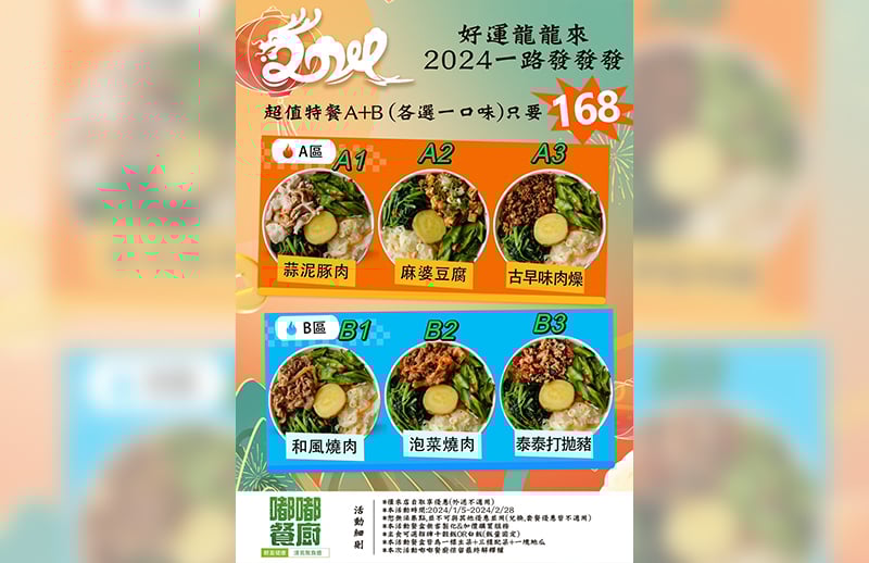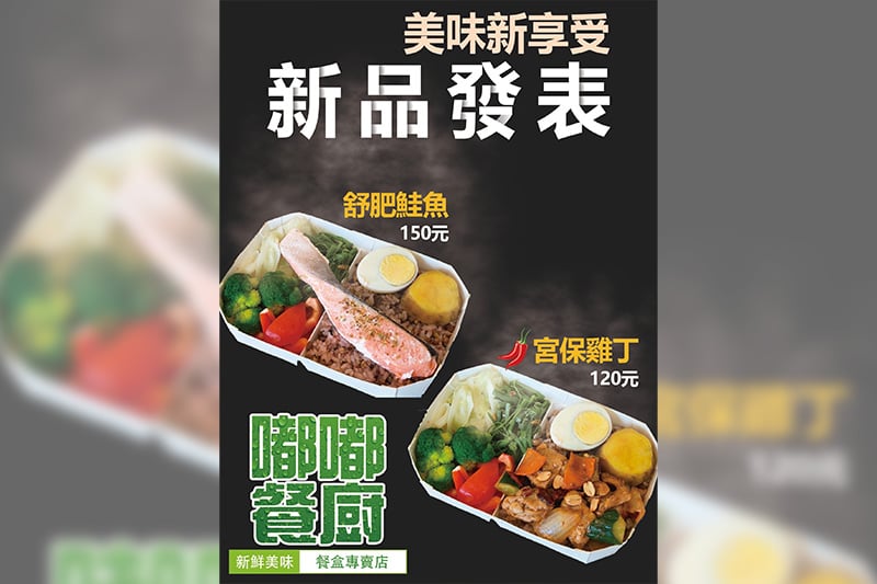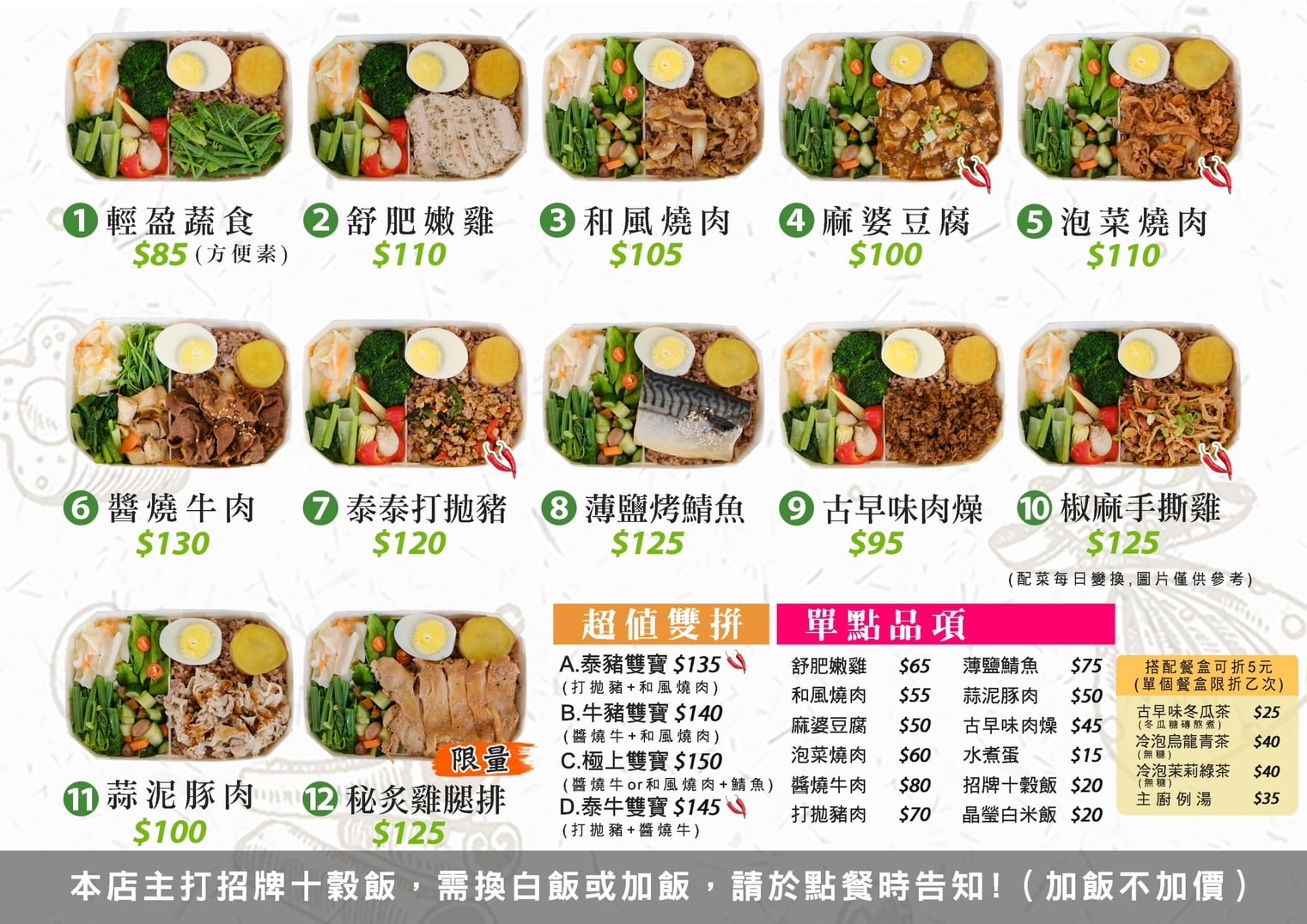 熱銷餐點 1. 輕盈蔬食(方便素) $85 + 嚴選當季時令蔬菜,清爽輕鬆吃 2. 舒肥嫩雞 $110 + 鮮嫩多汁,雞胸的蛋白質及低脂肪,低卡洛里的特性,幫助您維持好體態 3. 和風燒肉 $105 + 吸滿秘製醬汁,鹹甜飽滿的豬肉,配上鮮甜的洋蔥,大人小孩的最愛 4. 麻婆豆腐(小辣) $100 + 爆炒的絞肉配上吸滿醬汁的豆腐,微辣的開胃正好 5. 泡菜燒肉(小辣) $110 + 秘製燒肉遇上韓式泡菜,微辣爽口讓您一口接一口 6. 醬燒牛肉 $130 7. 泰泰打拋豬(小辣) $120 + 泰國最受歡迎的美味,嚴選溫體豬絞肉配上獨家醬汁,停不下來了 8. 薄鹽烤鯖魚 $125 + 嚴選挪威大鯖魚,豐富細膩的肉質,喜愛吃魚的您絕對不容錯過 9. 古早味肉燥 $95 + 多道程序的手工翻炒,讓您腦海中浮現記憶裡的味道 10. 椒麻手撕雞(小辣) $125 + 獨家研發的椒麻醬配上手撕雞胸,給您味蕾新饗宴 11. 蒜泥豚肉 $100 + 水煮豚肉配上特製蒜泥醬,清爽無負擔 12. 秘炙雞腿排 $125 + 每日的限量明星商品,趕快手刀預定吧 13. 泰豬雙寶(打拋豬+和風燒肉) $135 + 打拋豬+和風燒肉 14. 牛豬雙寶(醬燒牛+和風燒肉) $140 + 醬燒牛+和風燒肉 15. 極上雙寶(醬燒牛or和風燒肉+鯖魚) $150 + 醬燒牛or和風燒肉+鯖魚 16. 泰牛雙寶(醬燒牛+打拋豬) $145 + 醬燒牛+打拋豬